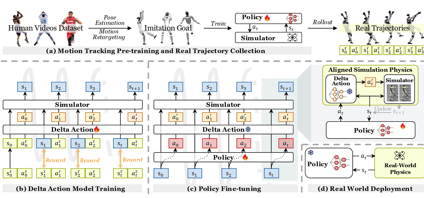 Delta动力学模型是弥补模拟与现实差距的关键工具: 数据收集:在真实机器人上执行预训练策略并记录状态-动作对 模型训练:学习一个映射fΔ:(st,at)↦ΔatfΔ:(st,at)↦Δat 模拟器修正:将ΔatΔat添加到原始动作中,使模拟器行为更接近现实 该模型的训练目标是最小化以下损失: LΔ=∥st+1sim−st+1real∥2+λ∥Δat∥2LΔ=∥st+1sim−st+1real∥2+λ∥Δat∥2