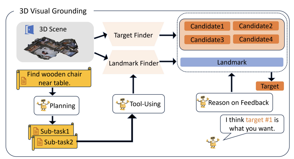 给定自然语言描述,三维定位涉及在三维场景中定位物体。这项任务需要强大的空间推理能力来处理复杂的指令,对于机器人和增强现实(AR)至关重要,因为它结合语言理解和三维空间推理。传统的三维定位方法在有限的三维数据集上进行完全监督学习,这些数据集包含预定义的物体描述,但它们难以泛化到未见过的物体,也难以处理复杂的文本。与传统方法不同,研究人员正在开发基于MLLM的方法,通过利用大规模先验信息显著提高泛化能力。